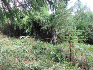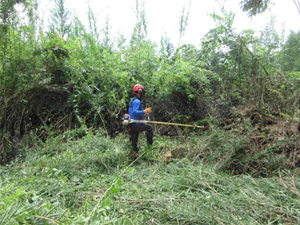 雑草木が密集しているため身動きが取れません。見通しが悪いため、お互いの位置は刈払機の音で判断する状態でした。